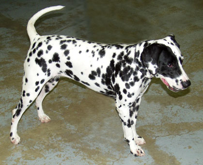 black and white spots with a large black patch over her right eye.